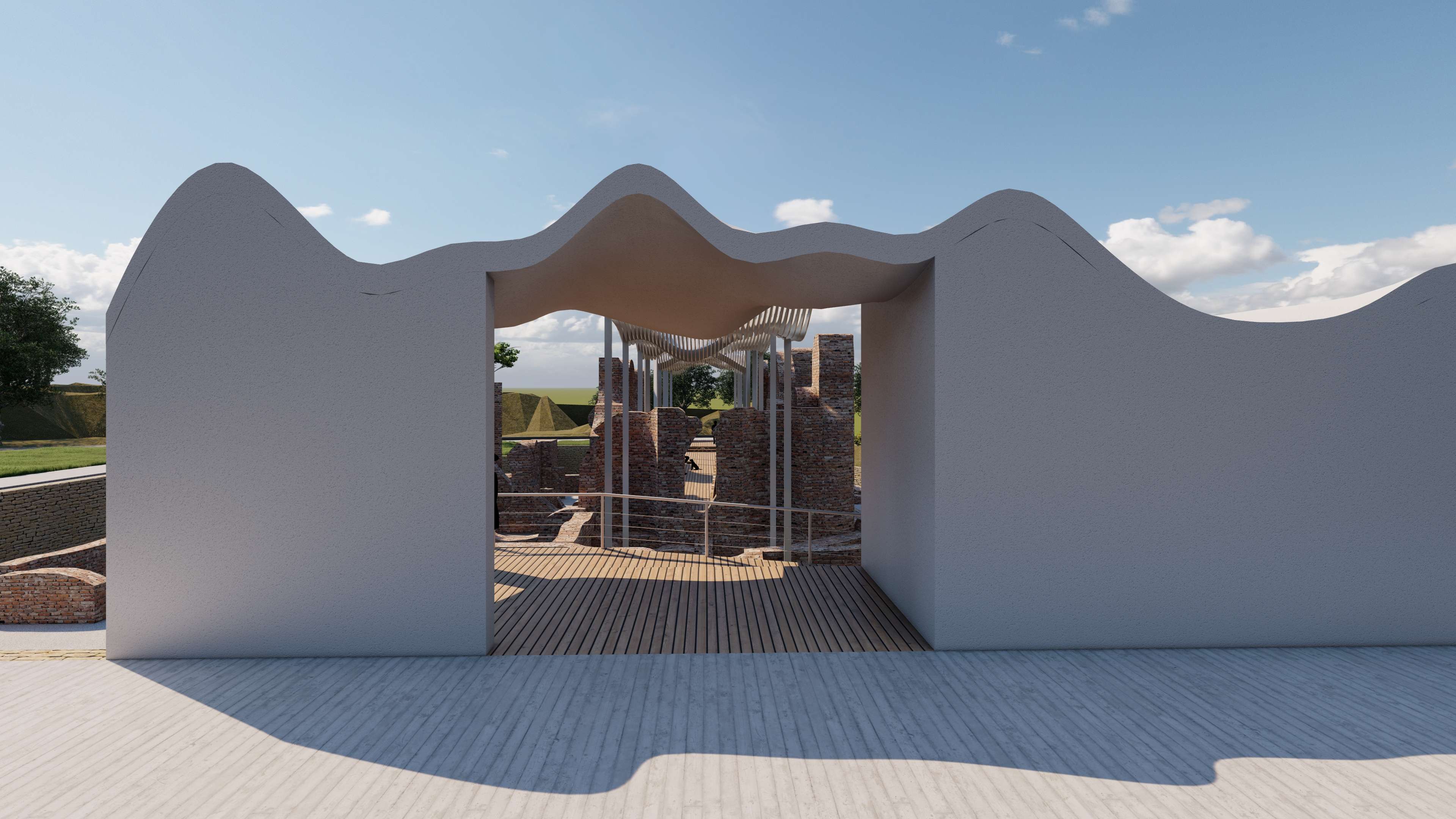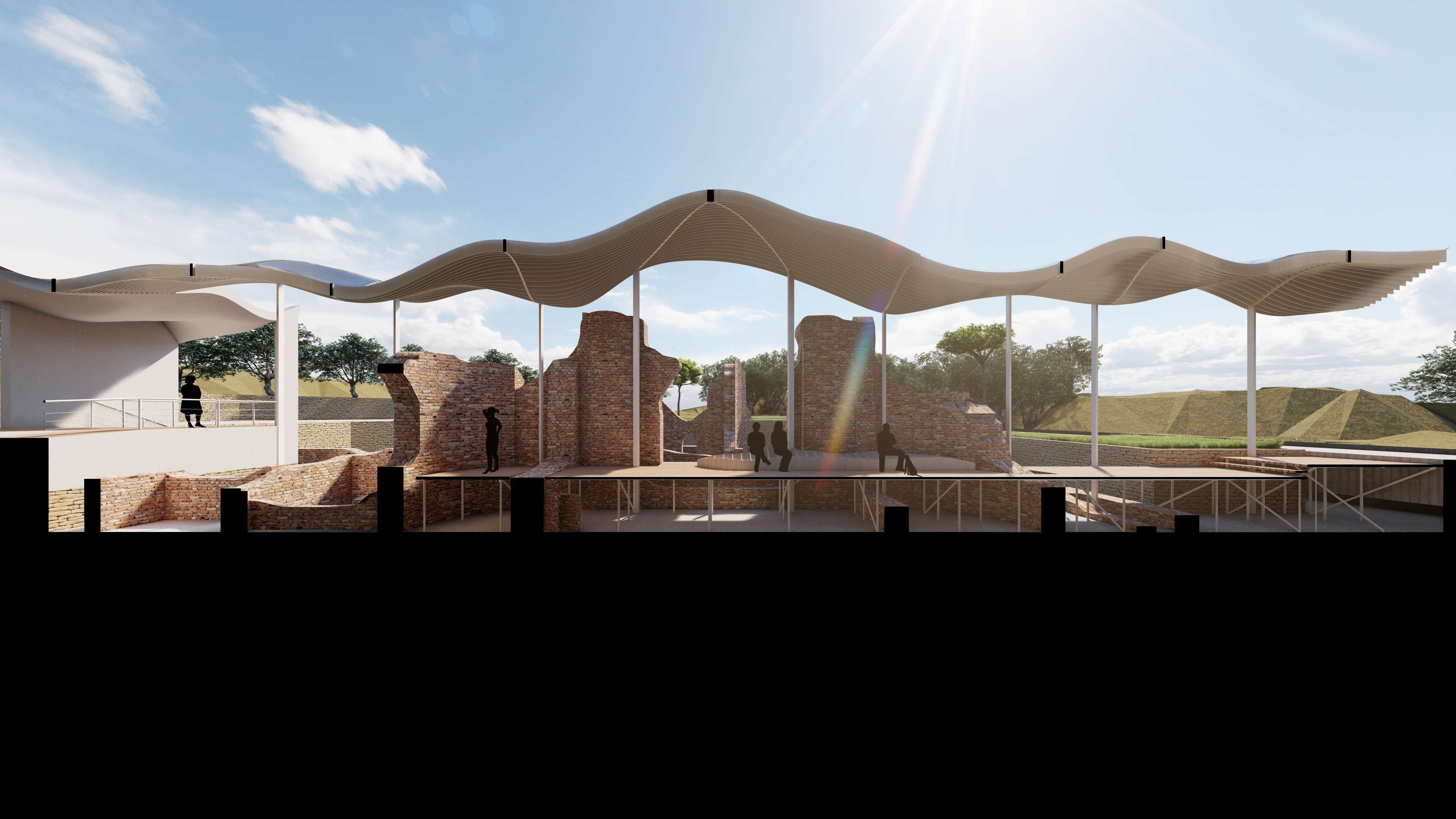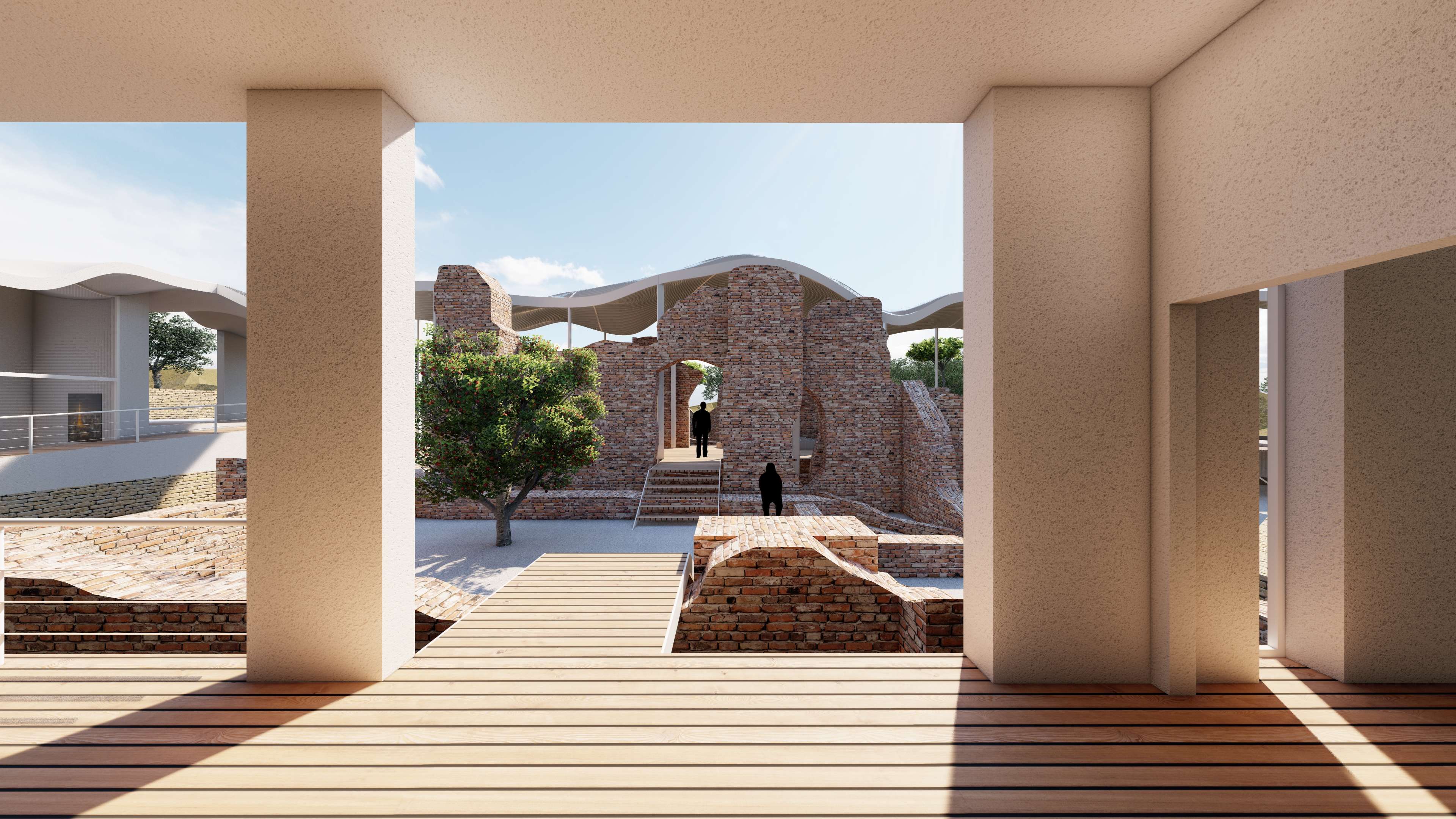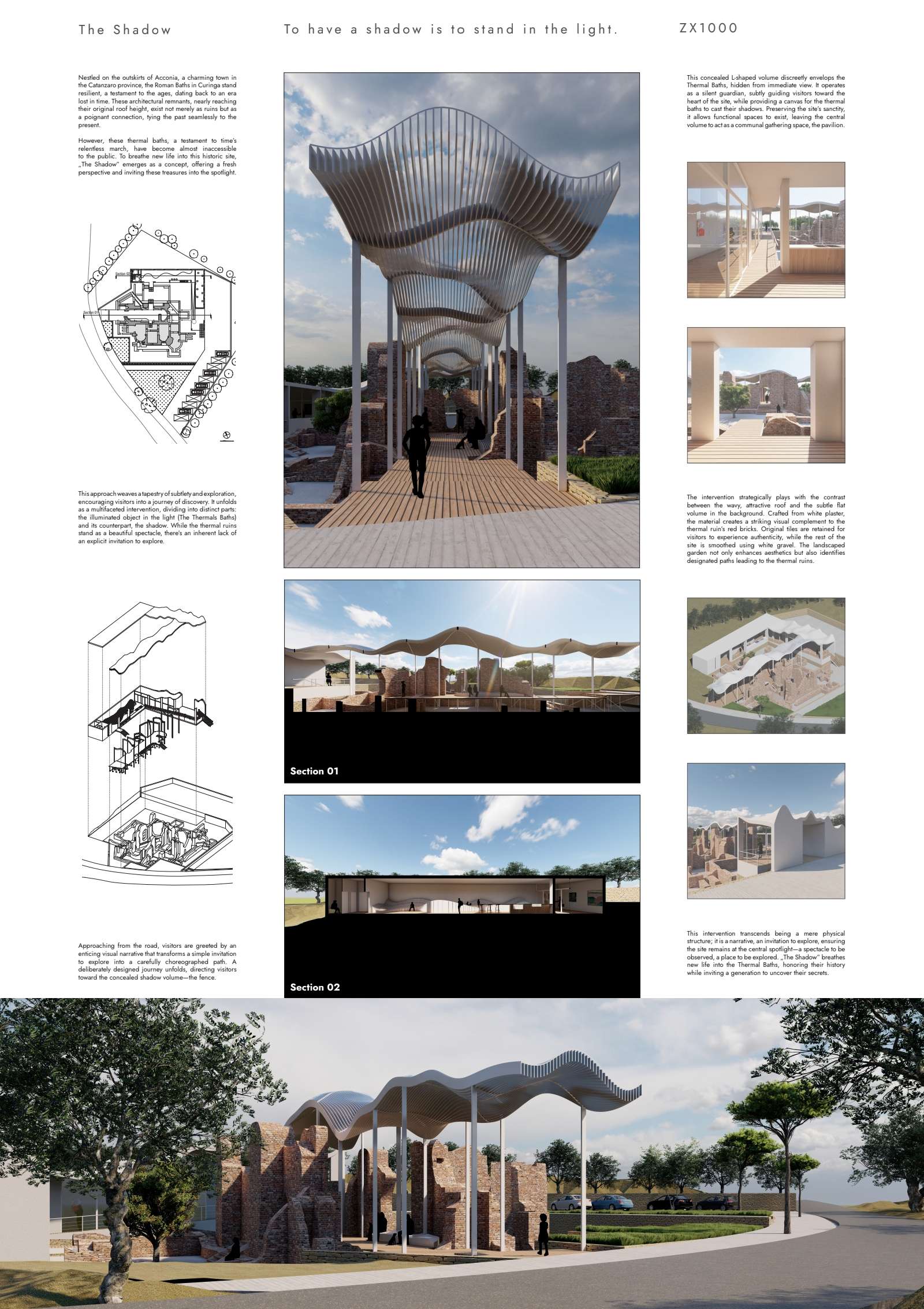 | Description | Nestled on the outskirts of Acconia, a charming town in the Catanzaro province, the Roman Baths in Curinga stand resilient, a testament to the ages, dating back to an era lost in time. These architectural remnants, nearly reaching their original roof height, exist not merely as ruins but as a poignant connection, tying the past seamlessly to the present. However, these thermal baths, a testament to time’s relentless march, have become almost inaccessible to the public. To breathe new life into this historic site, “The Shadow” emerges as a concept, offering a fresh perspective and inviting these treasures into the spotlight. This approach weaves a tapestry of subtlety and exploration, encouraging visitors into a journey of discovery. It unfolds as a multifaceted intervention, dividing into distinct parts: the illuminated object in the light (The Thermals Baths) and its counterpart, the shadow. While the thermal ruins stand as a beautiful spectacle, there’s an inherent lack of an explicit invitation to explore. Approaching from the road, visitors are greeted by an enticing visual narrative that transforms a simple invitation to explore into a carefully choreographed path. A deliberately designed journey unfolds, directing visitors toward the concealed shadow volume—the fence. This concealed L-shaped volume discreetly envelops the Thermal Baths, hidden from immediate view. It operates as a silent guardian, subtly guiding visitors toward the heart of the site, while providing a canvas for the thermal baths to cast their shadows. Preserving the site’s sanctity, it allows functional spaces to exist, leaving the central volume to act as a communal gathering space, the pavilion. The intervention strategically plays with the contrast between the wavy, attractive roof and the subtle flat volume in the background. Crafted from white plaster, the material creates a striking visual complement to the thermal ruin’s red bricks. Original tiles are retained for visitors to experience authenticity, while the rest of the site is smoothed using white gravel. The landscaped garden not only enhances aesthetics but also identifies designated paths leading to the thermal ruins. This intervention transcends being a mere physical structure; it is a narrative, an invitation to explore, ensuring the site remains at the central spotlight—a spectacle to be observed, a place to be explored. “The Shadow” breathes new life into the Thermal Baths, honoring their history while inviting a generation to uncover their secrets |