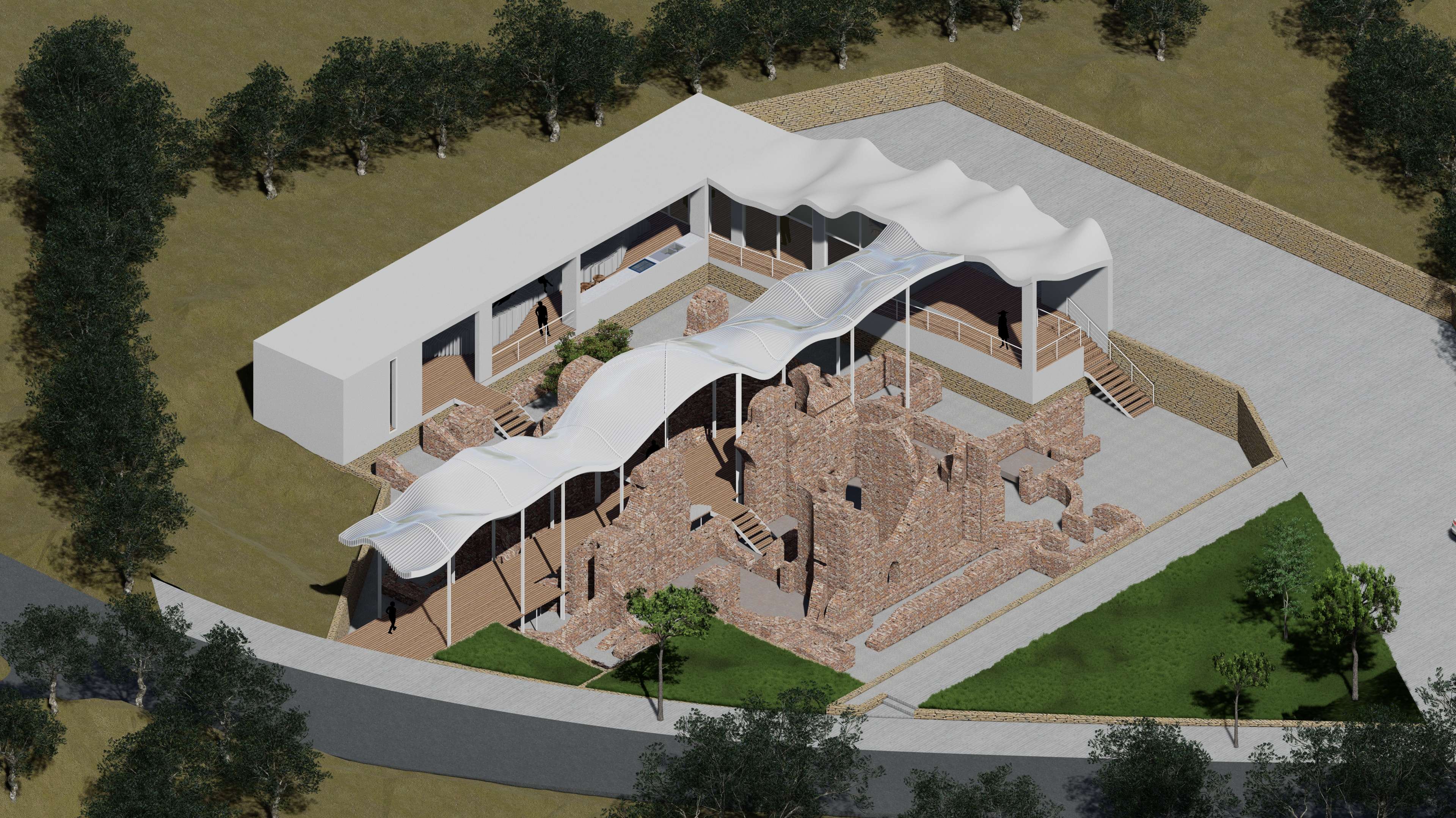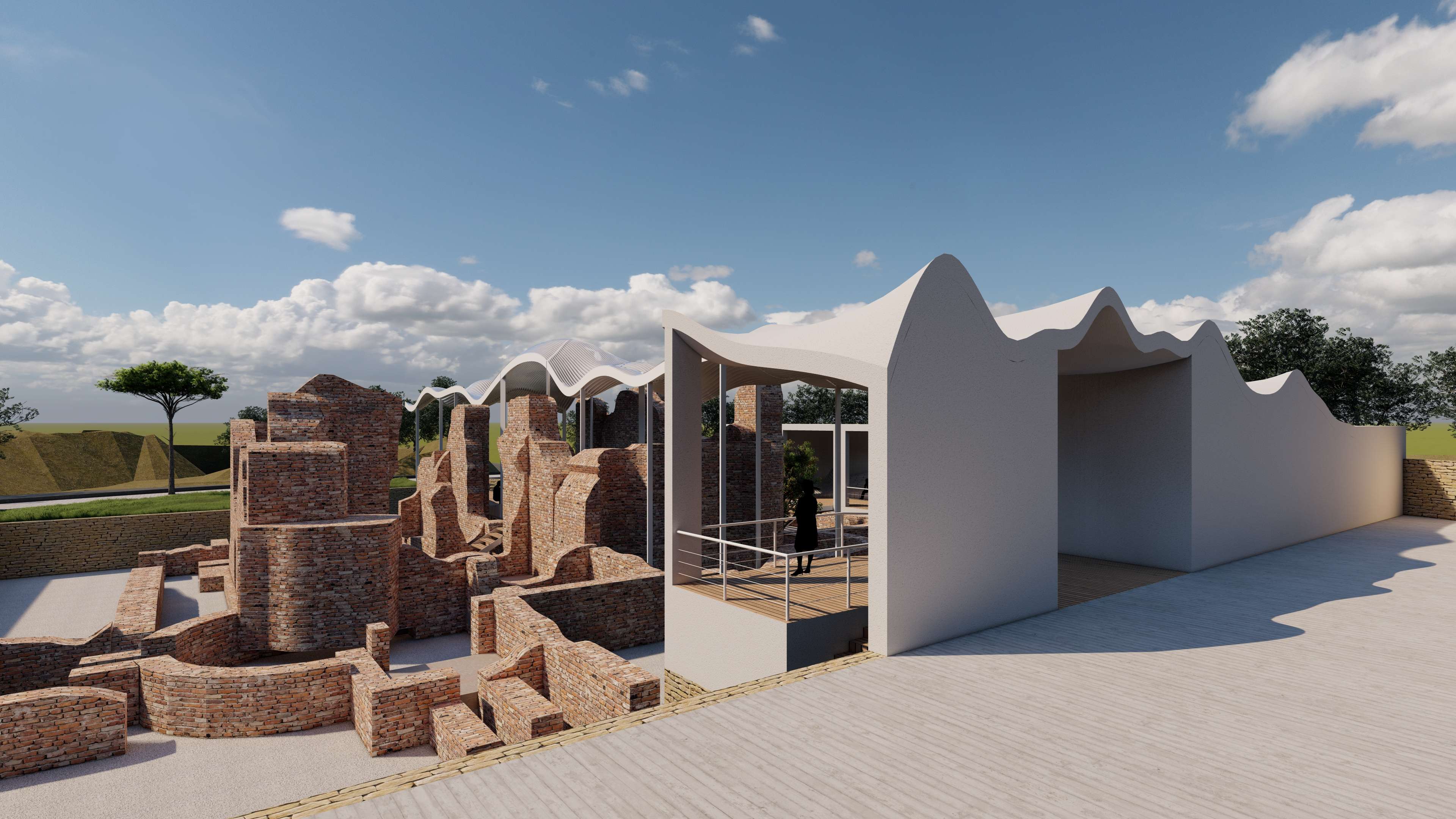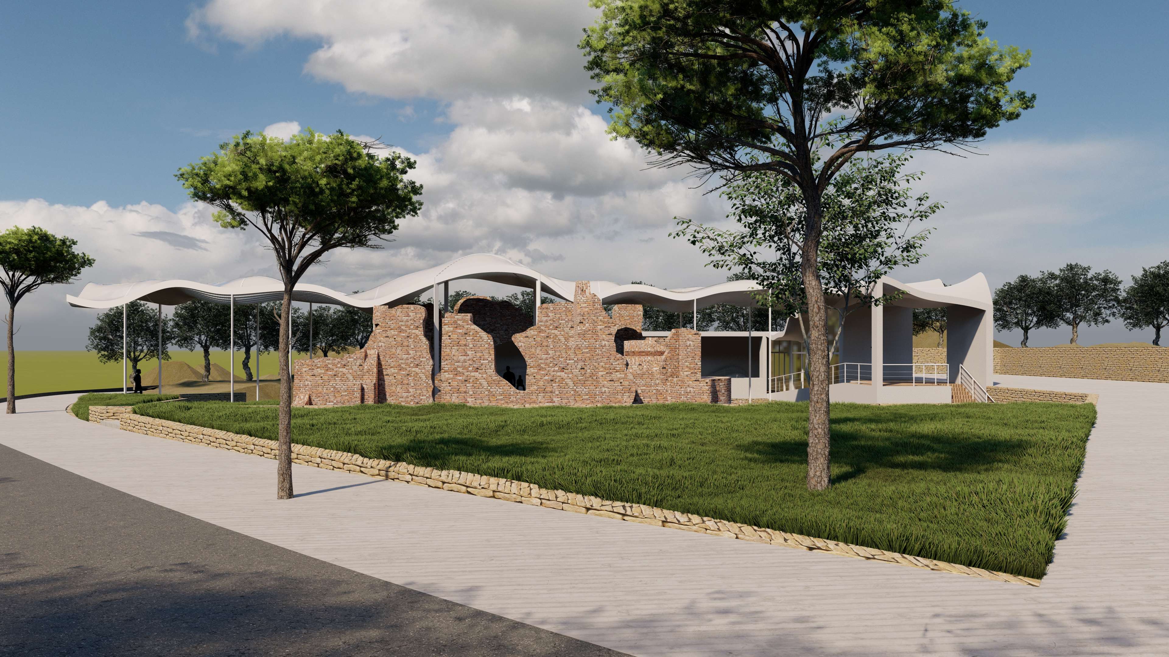 | Description | Nestled on the outskirts of Acconia, a charming town in the Catanzaro province, the Roman Baths in Curinga stand resilient, a testament to the ages, dating back to an era lost in time. These architectural remnants, nearly reaching their original roof height, exist not merely as ruins but as a poignant connection, tying the past seamlessly to the present. However, these thermal baths, a testament to time’s relentless march, have become almost inaccessible to the public. To breathe new life into this historic site, “The Shadow” emerges as a concept, offering a fresh perspective and inviting these treasures into the spotlight. This approach weaves a tapestry of subtlety and exploration, encouraging visitors into a journey of discovery. It unfolds as a multifaceted intervention, dividing into distinct parts: the illuminated object in the light (The Thermals Baths) and its counterpart, the shadow. While the thermal ruins stand as a beautiful spectacle, there’s an inherent lack of an explicit invitation to explore. Approaching from the road, visitors are greeted by an enticing visual narrative that transforms a simple invitation to explore into a carefully choreographed path. A deliberately designed journey unfolds, directing visitors toward the concealed shadow volume—the fence. This concealed L-shaped volume discreetly envelops the Thermal Baths, hidden from immediate view. It operates as a silent guardian, subtly guiding visitors toward the heart of the site, while providing a canvas for the thermal baths to cast their shadows. Preserving the site’s sanctity, it allows functional spaces to exist, leaving the central volume to act as a communal gathering space, the pavilion. The intervention strategically plays with the contrast between the wavy, attractive roof and the subtle flat volume in the background. Crafted from white plaster, the material creates a striking visual complement to the thermal ruin’s red bricks. Original tiles are retained for visitors to experience authenticity, while the rest of the site is smoothed using white gravel. The landscaped garden not only enhances aesthetics but also identifies designated paths leading to the thermal ruins. This intervention transcends being a mere physical structure; it is a narrative, an invitation to explore, ensuring the site remains at the central spotlight—a spectacle to be observed, a place to be explored. “The Shadow” breathes new life into the Thermal Baths, honoring their history while inviting a generation to uncover their secrets |