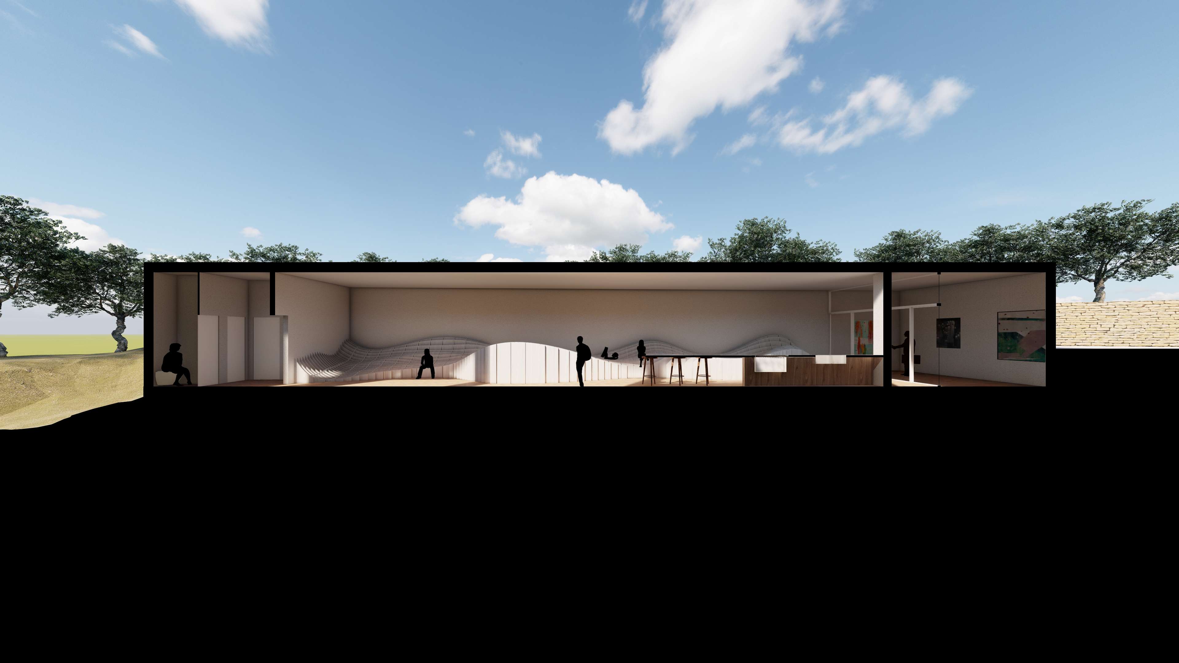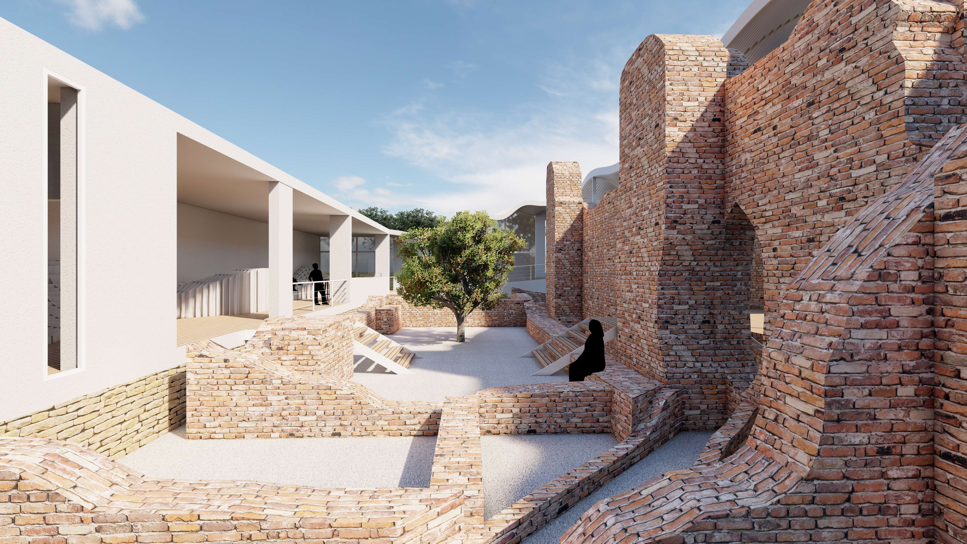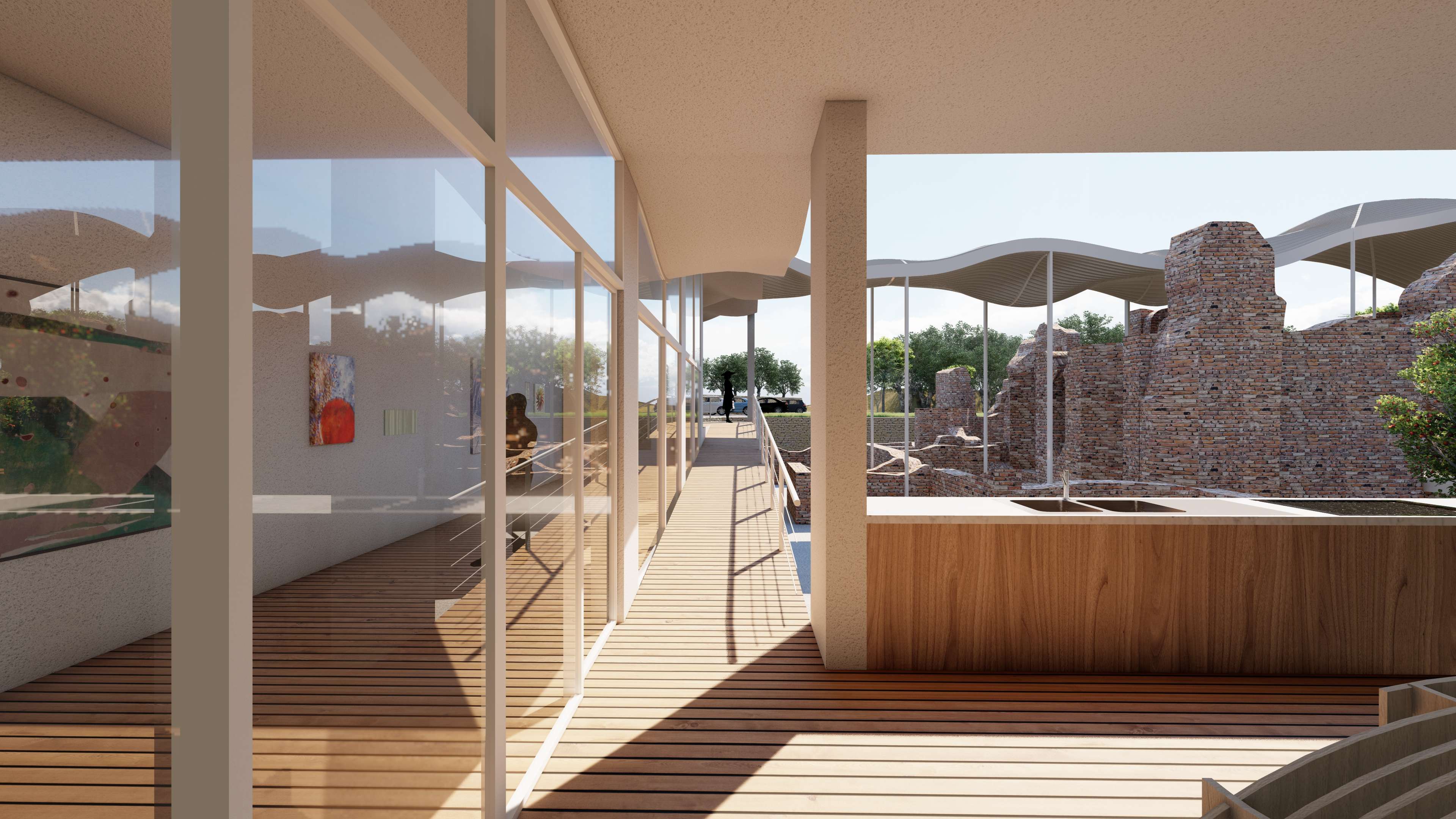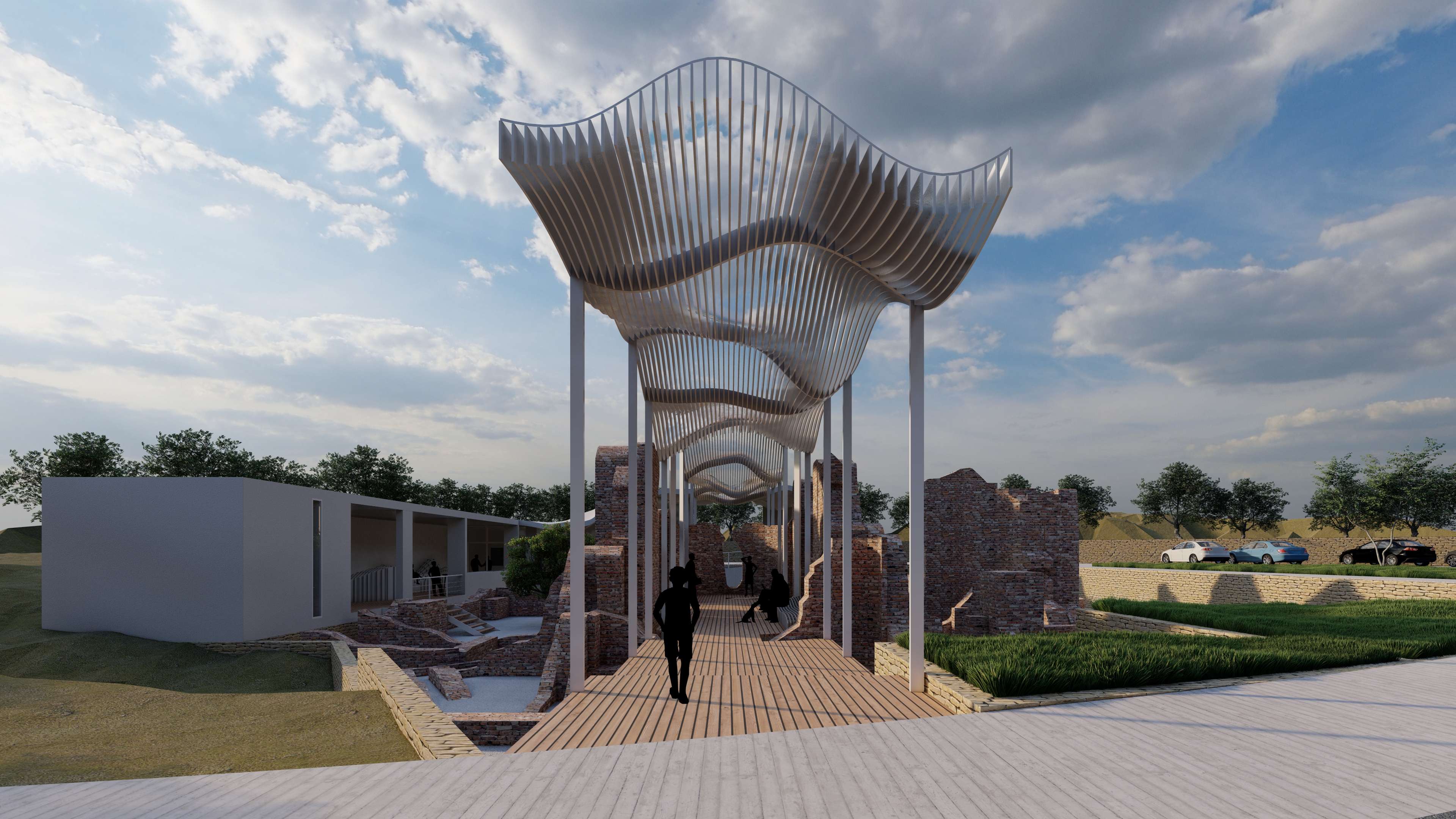 | Description | Nestled on the outskirts of Acconia, a charming town in the Catanzaro province, the Roman Baths in Curinga stand resilient, a testament to the ages, dating back to an era lost in time. These architectural remnants, nearly reaching their original roof height, exist not merely as ruins but as a poignant connection, tying the past seamlessly to the present. However, these thermal baths, a testament to time’s relentless march, have become almost inaccessible to the public. To breathe new life into this historic site, “The Shadow” emerges as a concept, offering a fresh perspective and inviting these treasures into the spotlight. This approach weaves a tapestry of subtlety and exploration, encouraging visitors into a journey of discovery. It unfolds as a multifaceted intervention, dividing into distinct parts: the illuminated object in the light (The Thermals Baths) and its counterpart, the shadow. While the thermal ruins stand as a beautiful spectacle, there’s an inherent lack of an explicit invitation to explore. Approaching from the road, visitors are greeted by an enticing visual narrative that transforms a simple invitation to explore into a carefully choreographed path. A deliberately designed journey unfolds, directing visitors toward the concealed shadow volume—the fence. This concealed L-shaped volume discreetly envelops the Thermal Baths, hidden from immediate view. It operates as a silent guardian, subtly guiding visitors toward the heart of the site, while providing a canvas for the thermal baths to cast their shadows. Preserving the site’s sanctity, it allows functional spaces to exist, leaving the central volume to act as a communal gathering space, the pavilion. The intervention strategically plays with the contrast between the wavy, attractive roof and the subtle flat volume in the background. Crafted from white plaster, the material creates a striking visual complement to the thermal ruin’s red bricks. Original tiles are retained for visitors to experience authenticity, while the rest of the site is smoothed using white gravel. The landscaped garden not only enhances aesthetics but also identifies designated paths leading to the thermal ruins. This intervention transcends being a mere physical structure; it is a narrative, an invitation to explore, ensuring the site remains at the central spotlight—a spectacle to be observed, a place to be explored. “The Shadow” breathes new life into the Thermal Baths, honoring their history while inviting a generation to uncover their secrets |